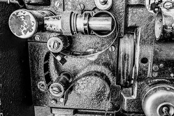 In "Gears of Cinema," the intricate details of an old film projector are captured in striking black and white.