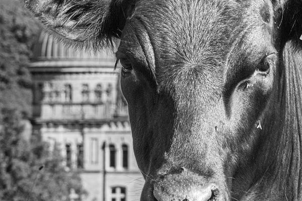 In "Rural Majesty," the powerful presence of a cow dominates the foreground, its expressive eyes and textured fur captured in exquisite detail.