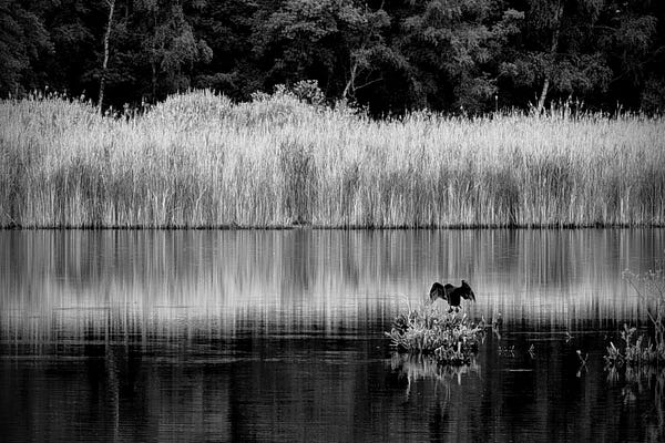 Solitude of the Wings…" A lone bird perches on a small island of reeds, its wings slightly spread as if poised for flight.