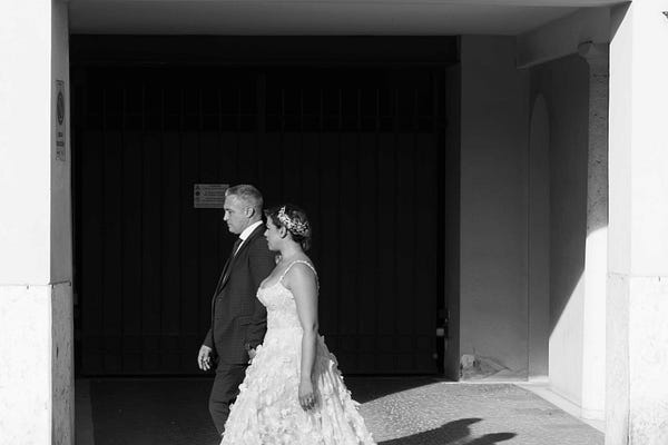 In "Shadows of Love," a bride and groom walk side by side, passing by a residential garage, their elegant forms casting long shadows on the pavement.