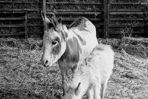 In "Donkey & Donkey," a heartwarming scene unfolds in a rustic barn as a mother donkey stands protectively over her young foal.