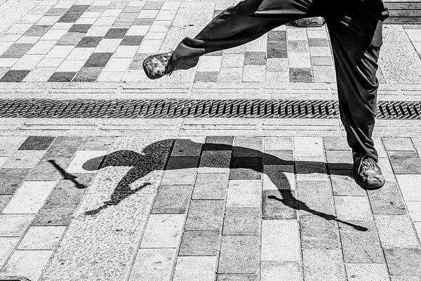 In "Fire Has No Shadow," a dynamic street scene is captured with an intriguing focus on shadows.